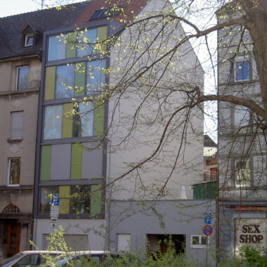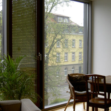 Besonders entwurfs- und raumprägend sind die vollflächig verglasten loftartigen 2-3 Zimmerwohnungen nach Westen zur Strasse und Baumallee und nach Osten in den Innenhof mit Balkonen. Die moderne Glasfassade mit erhöhten Schallschutzqualitäten und ihren perforierten Lüftungselementen in grünen Laubtönen, lassen interessante Ausblicke, auf die jahreszeitlich sich verändernde Baumlandschaft der Allee, zu.