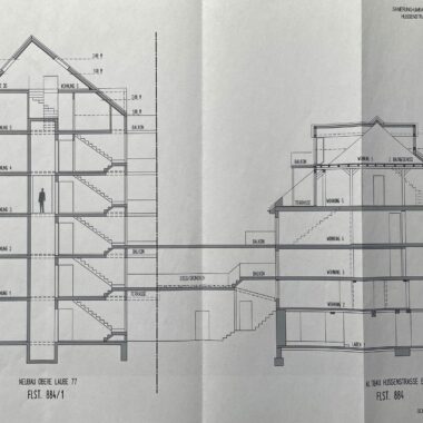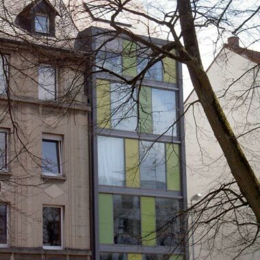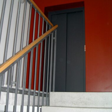 Durch den Einbau eines Aufzuges mit einem geschlossenen Treppenhaus, konnten zusätzlich 5 weitere Wohnungen eines mittelalterlichen Bürgerhauses über den rückwärtigen Innenhofbereich, mittels Stege, erschlossen werden.
