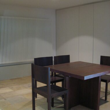 Die Einbauschränke im Foyerbereich in weißer Holzfaserplattenausführung mit Federzuhaltungen vermitteln keine Möbel, sondern funktionale Wandelemente. Die Innenraumgestaltung inkl. Belichtung der Nebenräume (Mehrzweckraum, Sakristei und Gesprächsraum) ist einheitlich und zurückhaltend, sie orientiert sich ebenfalls an der Schlichtheit des Kirchenraumes.